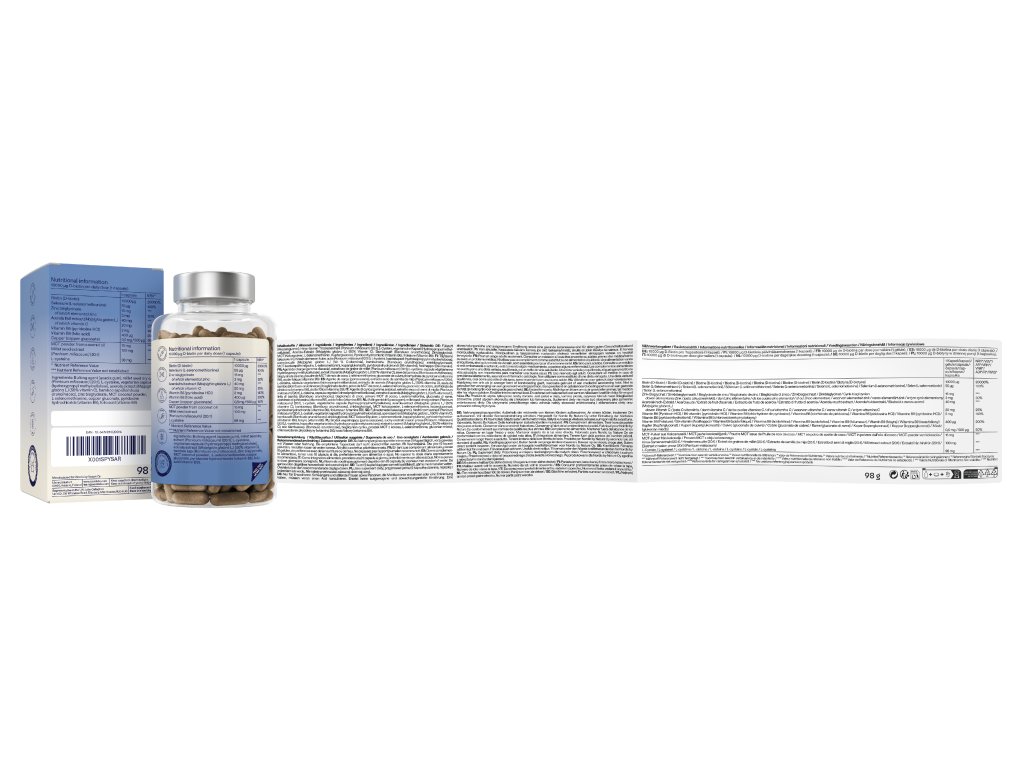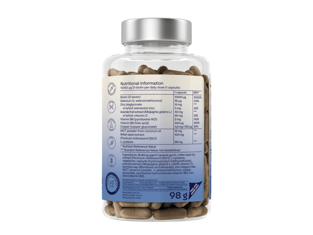 Složení: L-cystein, extrakt z prosa (Panicum miliaceum), extrakt z aceroly (Malpighia Glabra L.), rostlinné kapsle z hydroxypropylmethylcelulózy (HPMC), L-Selenomethionin, organická akáciová guma (Organic acacia gum), D-Biotin, Zinek Bisglycinát, MCT prášek, Pyridoxine HCL, Glukonát měďnatý (Copper gluconate), Kyselina listová.
