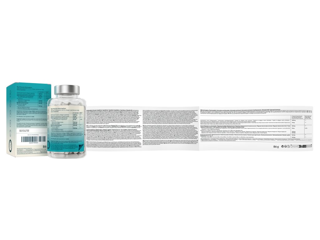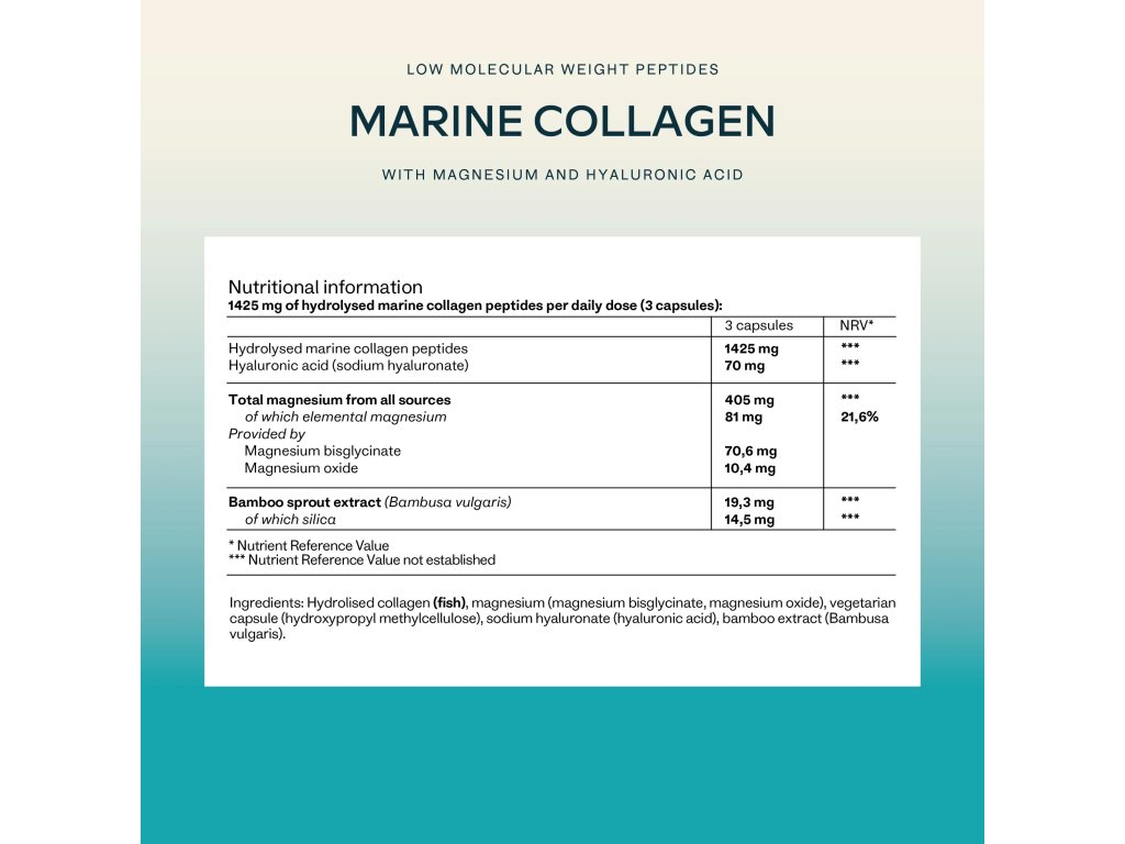 Složení: Kolagen (rybí), vegetariánská kapsle (HPMC), oxid hořečnatý, extrakt z Aceroly (Malpighia Glabra L.), kyselina hyaluronová, zahušťovadlo (organická akáciová guma).