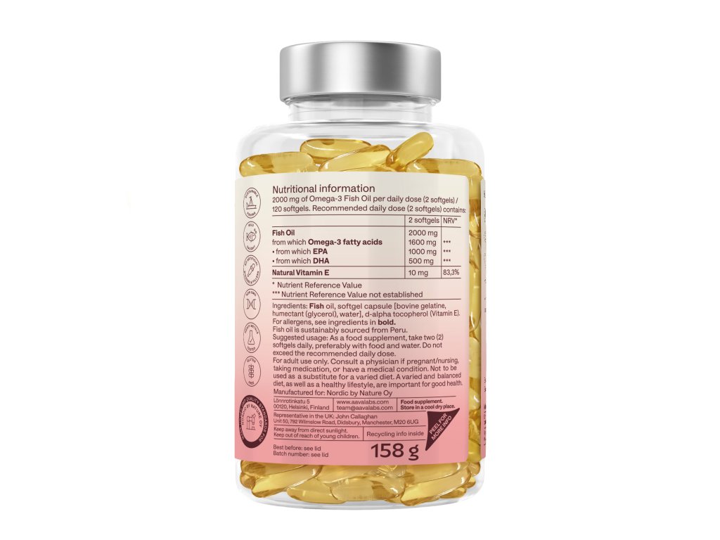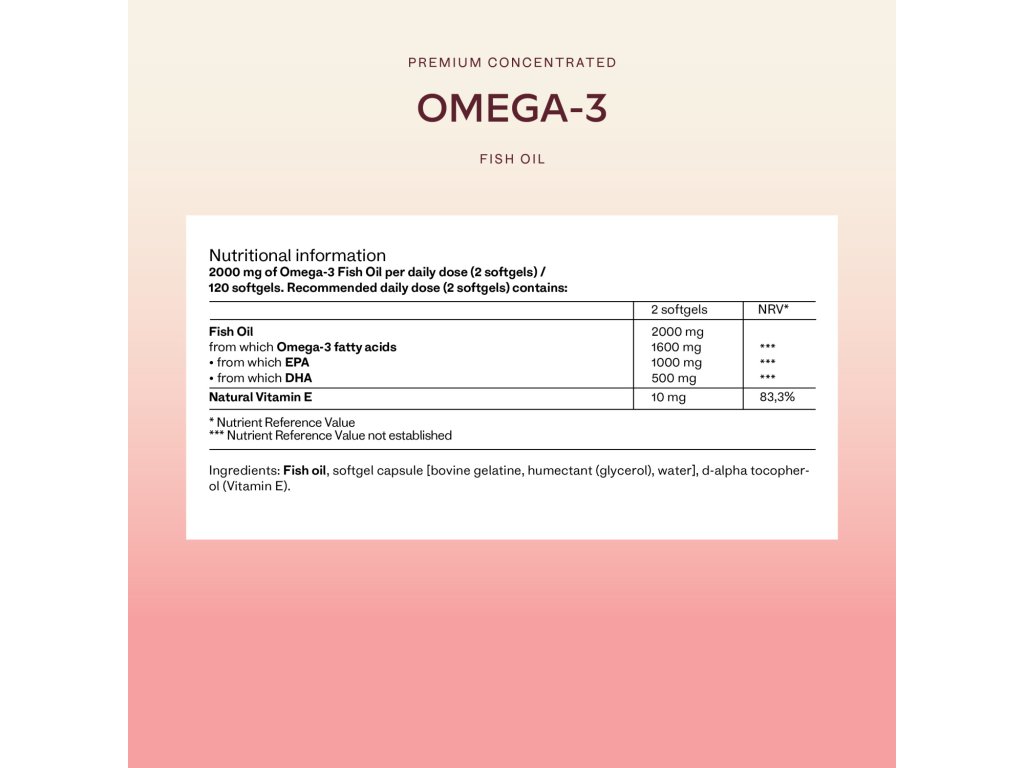 Složení: Rybí olej, gelové kapsle (želatina BOVINE), humektant (glycerol), voda, d-alpha tocopherol.