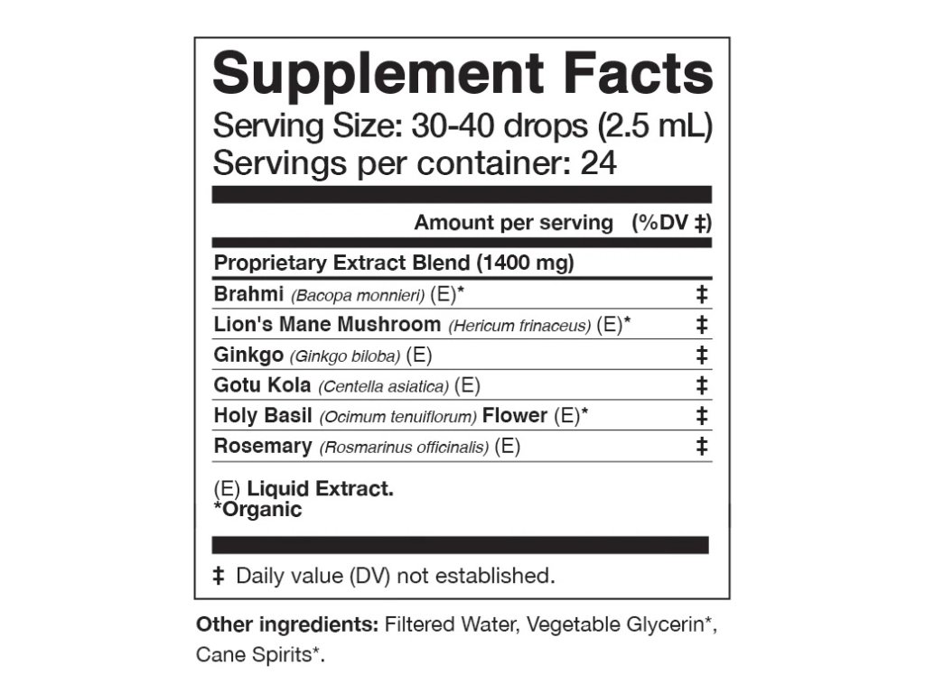 Složení: Brahmi (nať)*, lion's mane (výtažek z plodnice houby)*, ginkgo (list)*, gotu kola (list)*, bazalka posvátná (květ)*, rozmarýn lékařský (nať)*, třtinový alkohol*, rostlinný glycerin*, filtrovaná voda. *z ekologického zemědělství