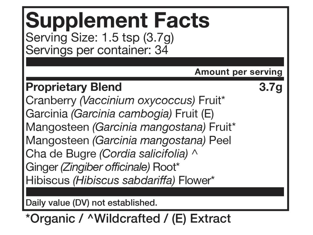 Složení: Brusinka (plod)*, Garcinia cambogia (plod), Mangostan (plod*), Mangostan (slupka),Cha de Bugre**, Zázvor (kořen)*, Ibišek (květ)*, *z ekologického zemědělství, **z volného sběru