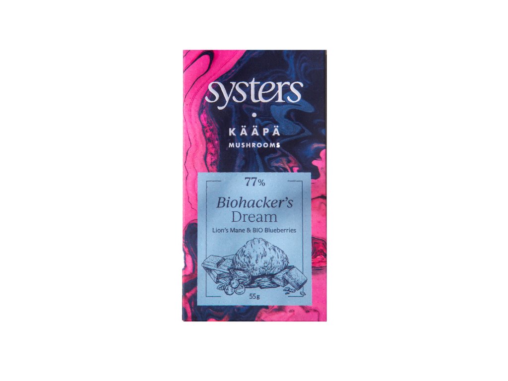 Jedinečná funkční čokoláda s adaptogeny vznikla spojením projektu Systers.bio a KÄÄPÄ Mushrooms, světově proslulé značky finských funkčních hub. Mlsání téhle čokolády není hřích, ale úžasný rituál. Nejde o pouhou potěchu smyslů, ale o blahodárné funkční palivo pro mysl i tělo. Hlavními hvězdami biohackerských čokošek jsou výtažky z adaptogenních hub – lion's mane a chaga. Oba druhy čokolády proto fungují jako superpotravina pro tělo i mozek, ve které najdeš spoustu zdraví prospěšných látek.