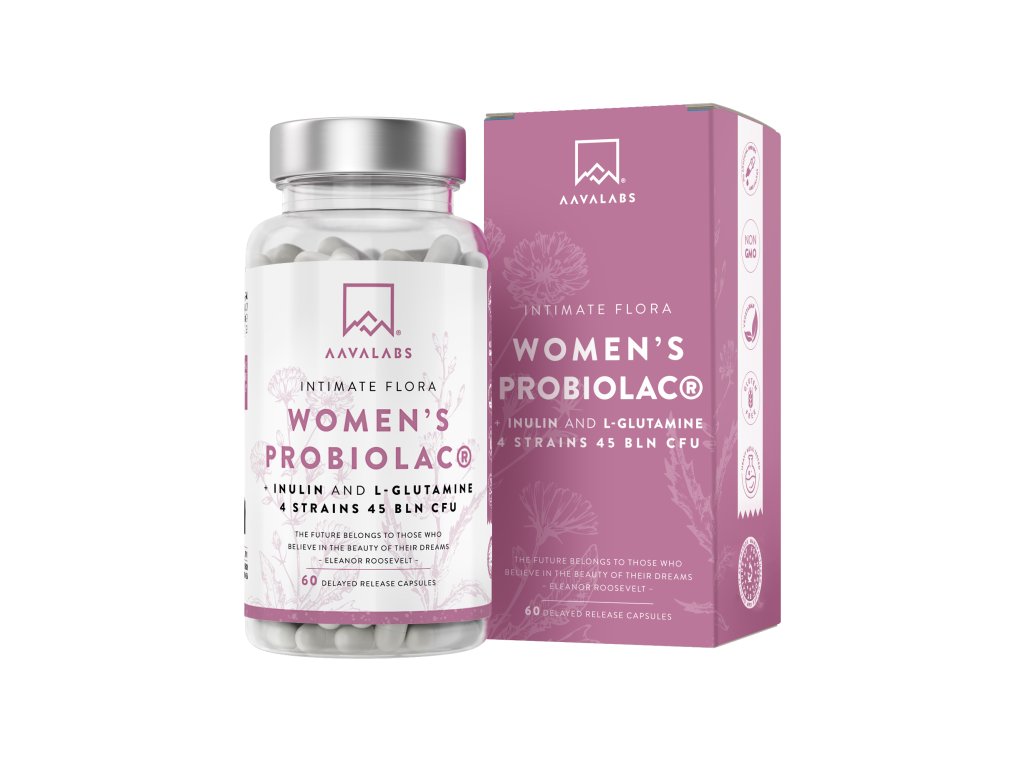 - Probiotika Women's Probiolac v Aavalabsu připravili ženám na míru. Fungují jako 2v1. Receptura obsahuje 4 účinné kmeny bakterií, které podporují nejen bakteriální rovnováhu ve střevě, ale i ve vaginální mikroflóře. Kromě nich v kapsli najdeš vlákninu (inulin) a L-glutamin pro podporu střev. Aby se spřátelené kolonie dostaly v pořádku až na místo určení, jsou uloženy v kapsli s prodlouženým uvolňováním a vstřebávají se až ve střevě.