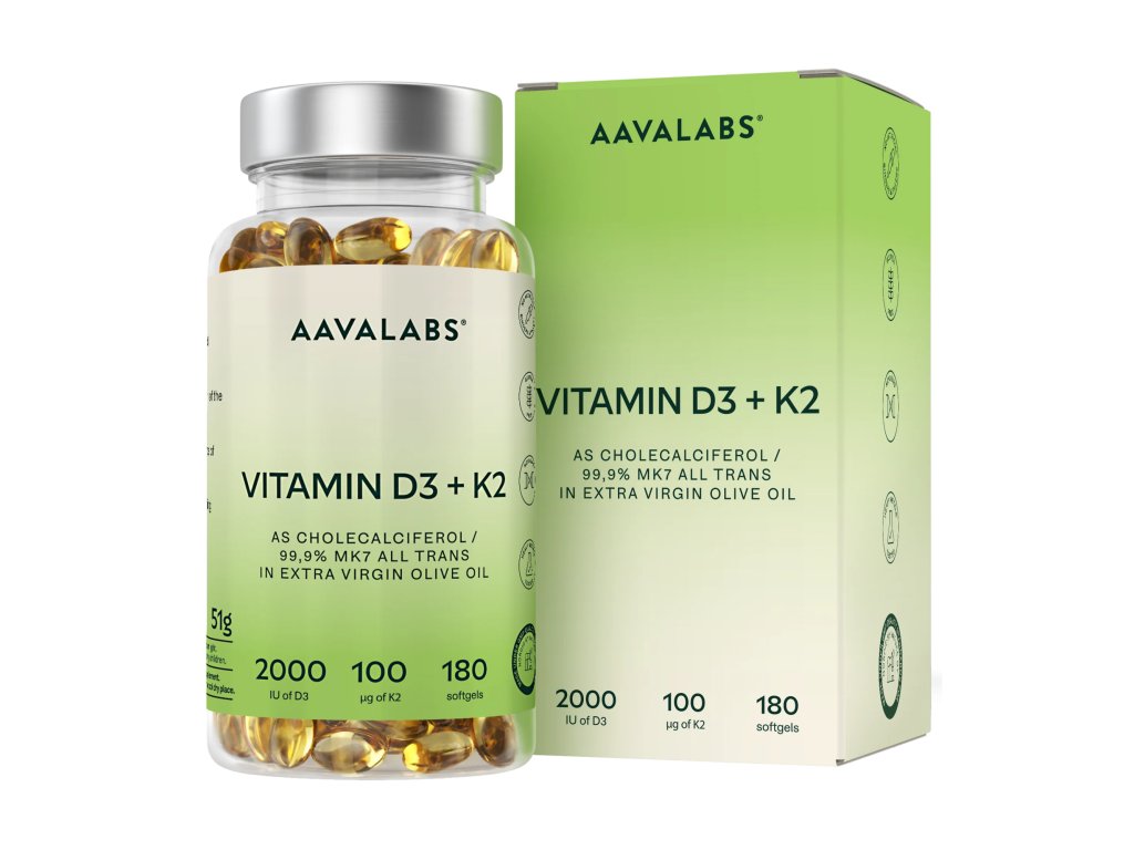 - Kapsle AAVALABS Vitamin D3 + K2 obohatí tvé tělo o dávku vitaminu D3 získaného z ovčího lanolinu, porci vitaminu K2 v jeho nejčistší formě – MK7 i panenský olivový olej. Tato svatá Aavalabs Trojice společně přispěje k dobrému stavu tvých kostí i svalů, podpoří vstřebávání a využití vápníku i fosforu a navíc podpoří tvůj imunitní systém.