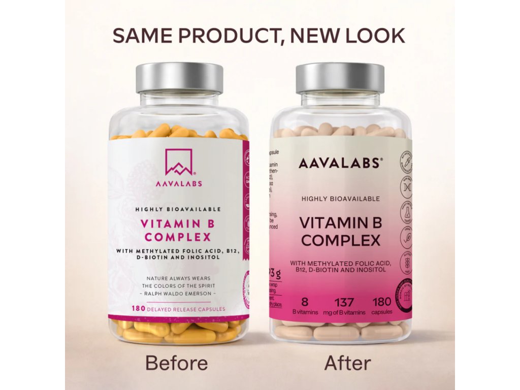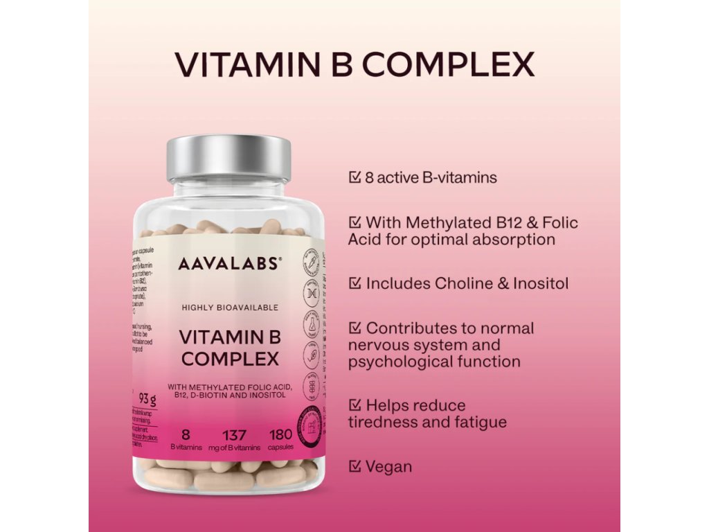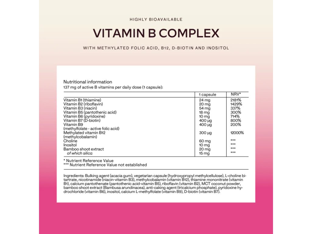 Ingredients: Bulking agent (acacia gum), nicotinamide (vitamin B3), vegetarian capsule (hypromellose), choline bitartrate, methylcobalamin (vitamin B12), thiamine hydrochloride (vitamin B1), pyridoxine hydrochloride (vitamin B6), calcium pantothenate (vitamin B5), riboflavin (vitamin B2), anticaking agent (tricalcium phosphate), bamboo extract, inositol, folic acid (vitamin B9), D-biotin (vitamin B8). Storage