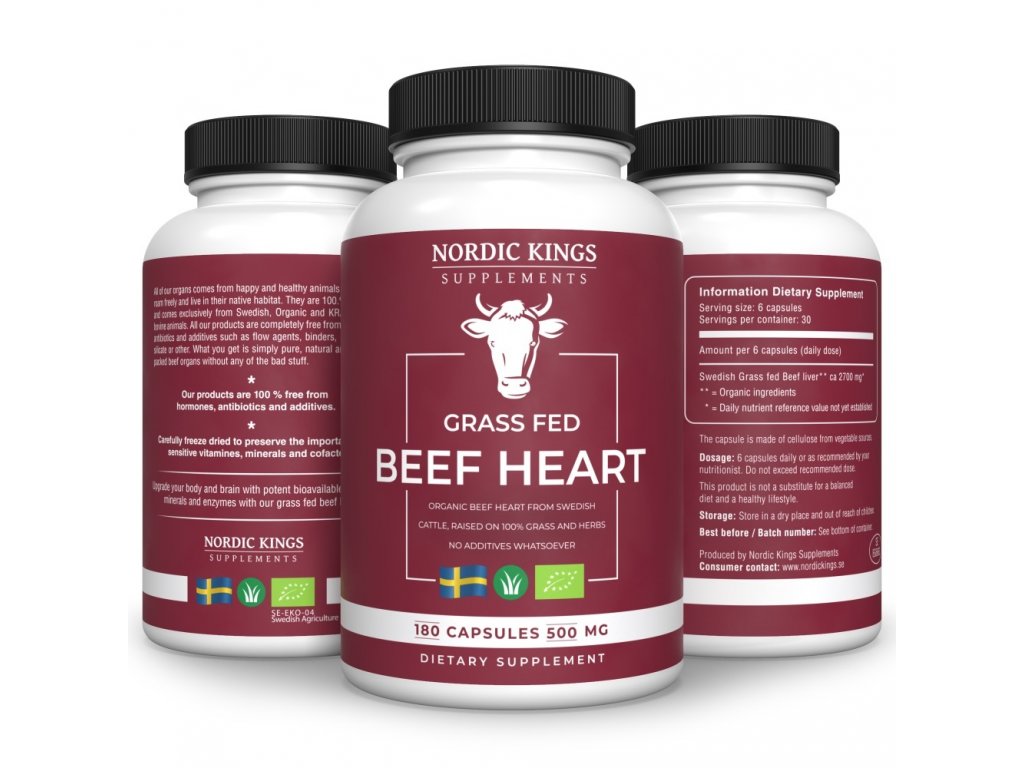 Složení: 100% srdce z bio hovězího dobytka z volného chovu ve Švédsku, obal kapsle z rostlinné celulózy.