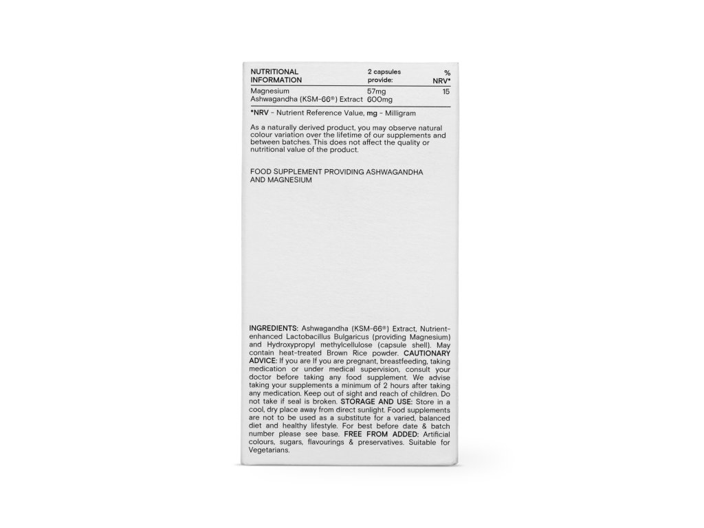 Složení: KSM-66® Extrakt z ašvagandy*, hořčík z minerály obohacené bakteriální kultury lactobacillus bulgaricus, tepelně ošetřený prášek z hnědé rýže, rostlinná celulóza (kapsle). *bio kvalita