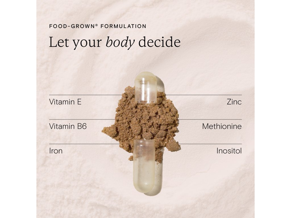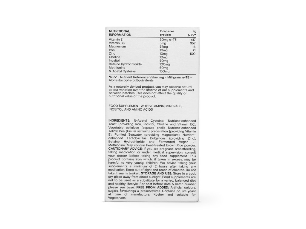 Složení: Žlutý hrášek (Pisum Sativum) obsahující vitamin E, kvasnice obohacené o minerály, obsahující vitamin B6, železo, cholin, inositol, Indole-3-carbinol, Lactobacillus bulgaricus se zvýšeným obsahem minerálů dodávající magnesium a zinek, aminokyselinami obohacené kvasnice obsahující methionin a cystein, prášek z ostropestřce mariánského*, betain hydrochlorid, prášek z tepelně upravené hnědé rýže, rostlinná celulóza (obal kapsle). *bio kvalita
