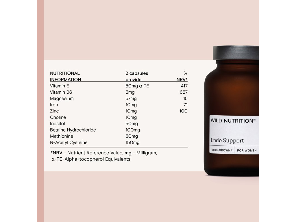 Za endometriózou stojí dominance estrogenu, proto Endo komplex obsahuje vitamin B6. Ten hraje důležitou roli v konjugaci a odbourávání estrogenu v játrech, čímž může pomoci k udržení jeho vyvážených hladin v těle. Hořčík pomůže zmírnit únavu a cholin s ostropestřcem mariánským podpoří správnou činnost jater, hlavního detoxikačního orgánu v tvém krásném těle. Protože je endometrióza zánětlivé onemocnění, obsahuje komplex i zinek a vitamin E, které přispívají k optimalizaci normálního imunitního systému. Z rostlin je vyrobený i ochranný obal kapslí a jistě tě potěší také úplná absence zbytečných plnidel či pojiv a umělých přísad.