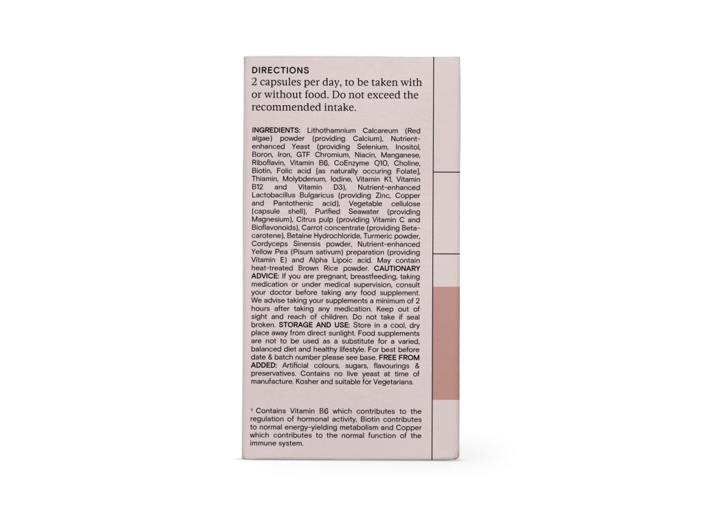 Vitamín B6 a zinek ti pomohou udržet dobrou náladu a balancují produkci hormonů, na nervovou soustavu působí i kyselina pantothenová a vitamín B12. Pro hormonální rovnováhu je stěžejní správná funkce štítné žlázy, tu podporuje obsažený jód a selen. Možná v tomto období pozoruješ zvýšenou chuť k jídlu, ve Wild Nutrition proto mysleli i na udržování přirozené váhy. Obsažený chrom přispívá ke správnému metabolismu živin a udržování stabilní hladiny cukru v krvi. Komplex vitamínu D, zinku, vápníku a hořčíku pak přispěje k přirozené pevnosti kostí a hořčík zmírní únavu a vyčerpání. Imunitě dá opěrnou berličku například vitamín C a B12 a adaptogenní houba cordyceps tě podpoří v čase zásadní životní změny. Výčet všech aktivních látek by vystačil na esej, můžeš však mít jistotu, že je výrobce promyšleně zkombinoval tak, abys období menopauzy prožila s co největší lehkostí.