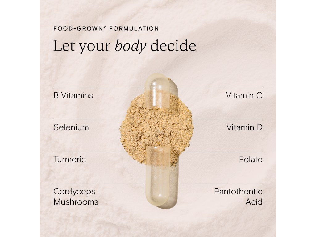 - Jeho složení je čisté, bez syntetických nesmyslů. Výrobce si drží vysoké standardy a veškeré živiny extrahuje ze skutečných potravin. Čistě rostlinné kapsle navíc neobsahují zbytečná plnidla, ani pojiva, syntetické konzervanty či barviva. Nenajdeš v nich časté alergeny, GMO, laktózu ani lepek.