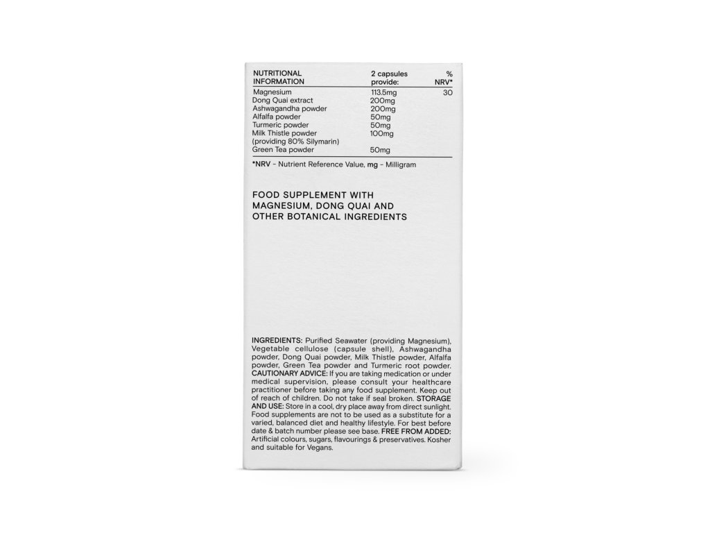 Složení: Hořčík z bakteriálních kultur Lactobacillus bulgaricus, extrakt z Dong Quai, prášek z ašvagandy*, prášek z vojtěšky, kurkumový prášek*, prášek z ostropestřce mariánského*, prášek ze zeleného čaje, tepelně ošetřený prášek z hnědé rýže, rostlinná celulóza (kapsle). *bio kvalita