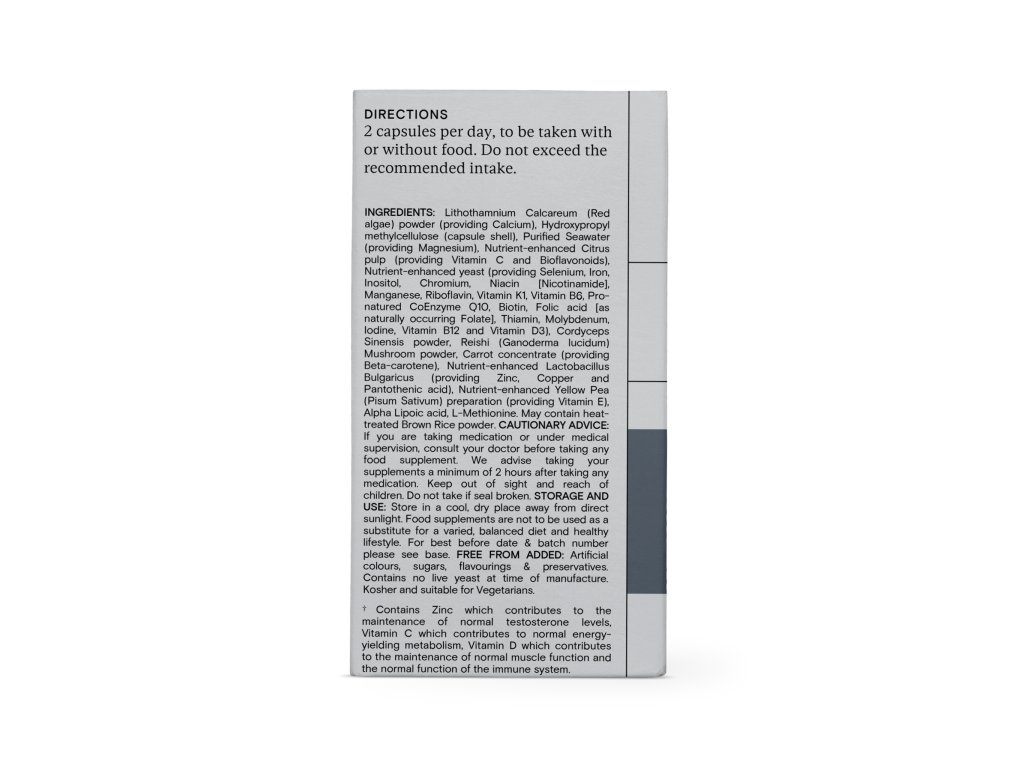 Tento komplexní doplněk stravy spojuje široké spektrum vitamínů, minerálů, bylin a blahodárných výtažků z adaptogenních hub, které pomáhají tělu zvládat každodenní nápor. Vitamín B12, Céčko, železo, selen i kyselina listová prospějí přirozené imunitě. Zinek pak podpoří normální plodnost, pomáhá udržovat přirozenou hladinu testosteronu v krvi a přispívá správnému stavu kostí, vlasů i pokožky. Ke slovu se hlásí i hořčík, který pomáhá mírnit vyčerpání, podporuje přirozenou regeneraci svalů po sportu i činnost nervů. Aktivních látek obsahují kapsle mnohem víc a výrobce je promyšleně namíchal tak, aby muži lépe zvládali nápor všeho druhu, včetně denního pohybu v ulicích znečištěného města a pracovního přepětí.