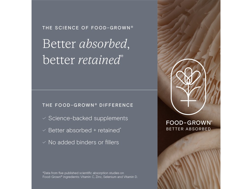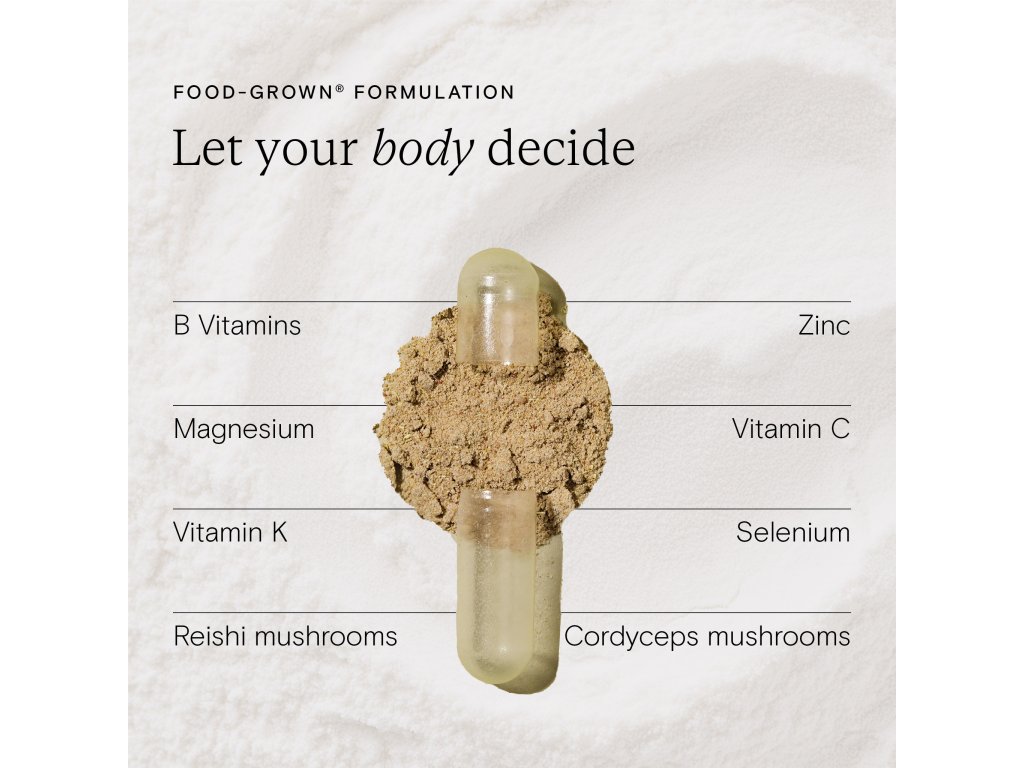 Složení: Vitamín C a bioflavonoidy obsažené v citrusové dužině, beta-karoten obsažený v mrkvovém koncentrátu, vitamíny a minerály obohacené kvasnice; thiamin, riboflavin, vitamin B6, vitamin B12, biotin, inositol, vitamin D3, niacin, kyselinu pantotenovou, chrom GTF, pro-naturální koenzym Q10, L-methionin, železo, mangan, selen, molybden, jód, kyselina listová (jako přirozeně se vyskytující folát) a vitamin K, žlutý hrách (Pisum Sativum) poskytující vitamin E, Lactobacillus bulgaricus se zvýšeným obsahem vitaminů a minerálů; hořčík, měď, zinek, kyselinu pantotenovou a vápník, kyselina alfa-lipoová, prášek z Cordycepsu sinensis, prášek z houby Reishi, prášek z tepelně upravené hnědé rýže, rostlinná celulóza (obal kapsle).