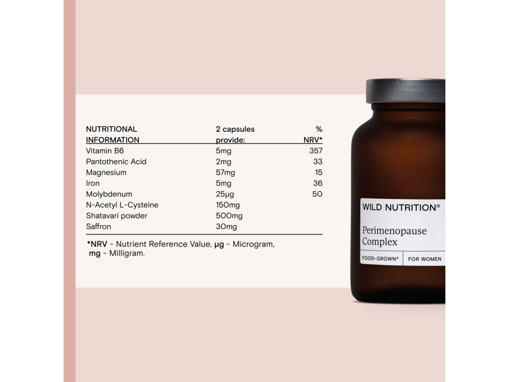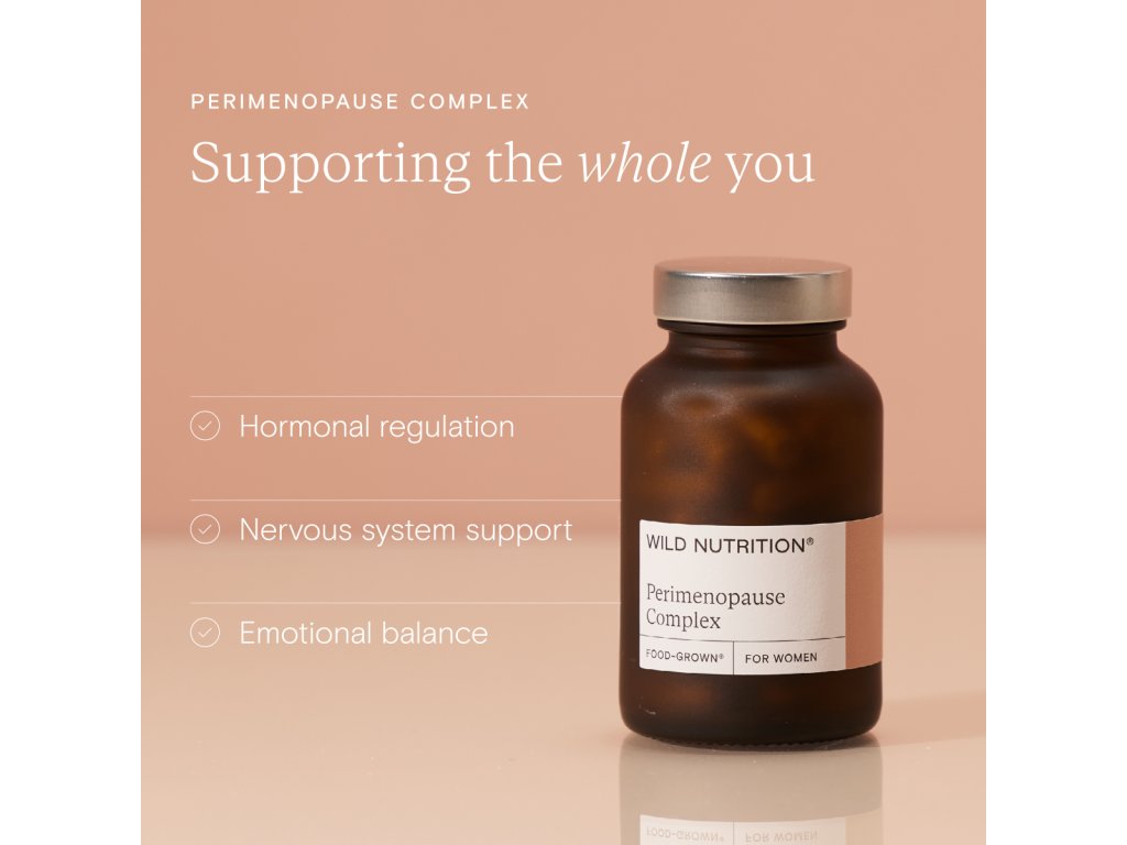 O premenopauze i perimenopauze se moc neví, ani samy ženy si často neuvědomují, že jde o etapy s jinými výzvami, než jaké přinese menopauza jako taková. Perimenopauza je ze čtyř fází menopauzy nejvíc fyzicky náročná. Charakteristické jsou zejména změny cyklu dané úbytkem estrogenu (menstruace může být silnější a delší, ale i lehčí a kratší, nebo jen celkově nepravidelnější) a změny nálad, někdy výrazné až prudké. Wild Nutrition si na perimenopauzu dělal i vlastní výzkum. Výsledkem je tenhle komplex, který obsahuje – kromě vitaminů a minerálů v čele s B6 – dvě výjimečné rostlinné látky – šatavari a šafrán Safr'Inside™, aby podpořil tuto málo uznávanou životní etapu. Perimenopause complex můžeš doplnit i mulťákem pro ženy od Wild Nutrition.