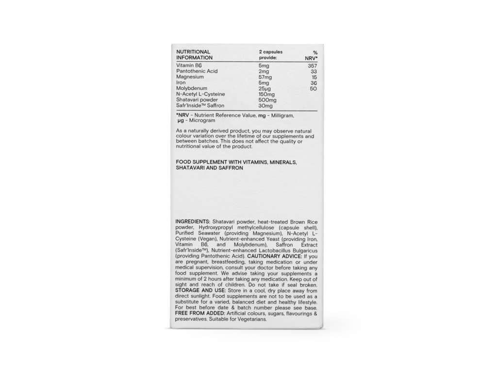 Složení: Šatavari v prášku, mouka z hnědé rýže, rostlinná celulóza (obal kapsle), čištěná mořská voda (dodávající hořčík), N-acetyl-L-Cystein Vegan, kvasnice obohacené o vitamíny a minerály, dodávající železo, vitamín B6 a molybden, extrakt ze šafránu (Safr'Inside™), Lactobacillus bulgaricus v kombinaci s kyselinou pantotenovou.