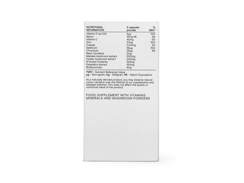 Samozřejmě nechybí vitamín D3 a vitamín C, které podpoří tvou přirozenou obranyschopnost. Tělu s ním ale dodáš i další blahodárné výtažky, třeba ten z hlívy ústřičné a houby maitake a také antioxidanty nabitý černý bez a zinek. Komplex je vhodný i pro děti a těhotné. Balený je v rostlinných kapslích, ocení ho tedy i veganky.