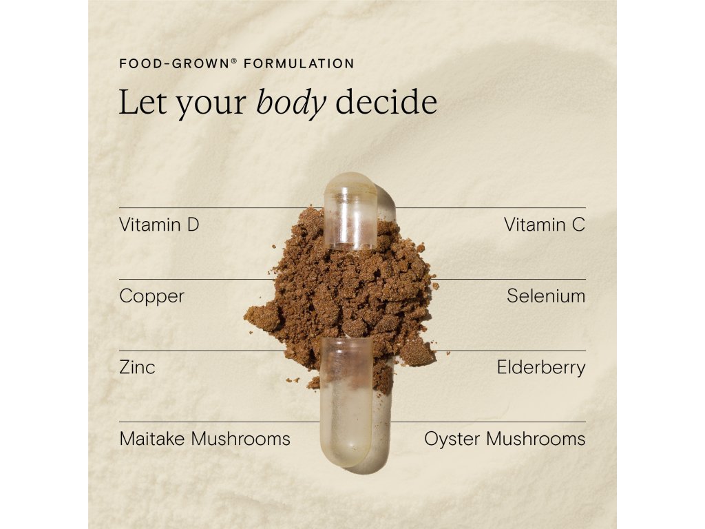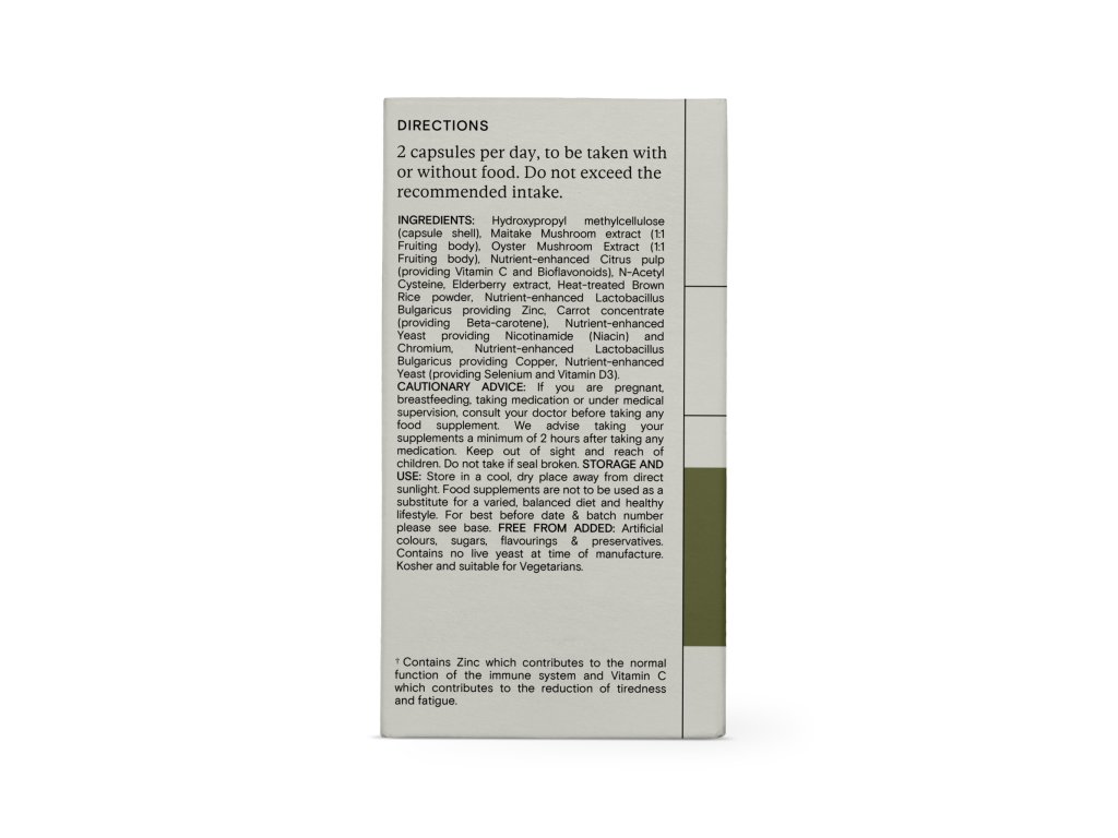 Složení: Vitamín C a bioflavonoidy obsažené v citrusové dužině, minerály obohacené kvasnice – Vitamín D3, Niacin, selen a GTF** chrom; Lactobacillus bulgaricus – zinek a měď, Betakaroten obsažený v mrkvovém koncentrátu, N-acetylový cystein, extrakt z bezu, prášek z houby maitake (mycelizovaný) a prášek z hlívy ústřičné (mycelizovaný), tepelně ošetřený prášek z hnědé rýže, rostlinná celulóza (kapsle).